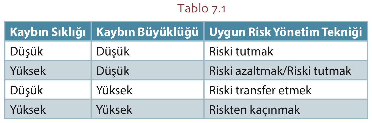 Kaybın sıklığı düşük ve kaybın büyüklüğü yüksek ise uygun risk yönetim tekniği riski transfer etmektir.