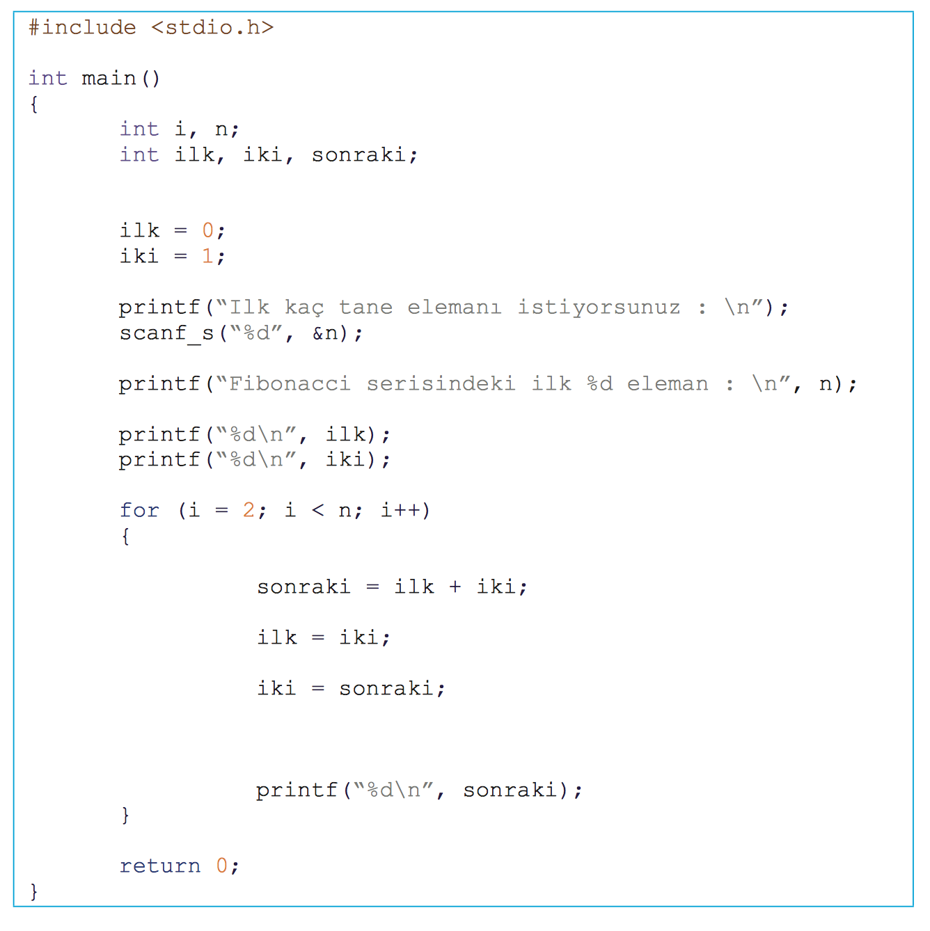Şimdi, bu serinin elemanlarını hesaplayan tekrarlamalı bir algoritma yazalım. Serinin tanımında ilk elemanın 0 ve ikinci elemanın 1 olduğu belirtilmişti. Bu doğrultuda, programımızda üç farklı değişken (ilk, iki, sonraki) tanımlayıp programın başlangıcında ilk değişkenine 0 ve iki değişkenine 1 değeri atıyoruz. Sonra, ilk ve son elemanlarını toplayıp serinin tanımında verildiği gibi bir sonraki elemanın değerini hesaplıyoruz. Sonraki iterasyona geçmeden önce ilk ve iki değişkenlerimizin değerini güncelliyoruz. Böylece, bir döngü içerisinde istenilen sayı kadar Fibonacci serisindeki elemanları hesaplayabiliyoruz.