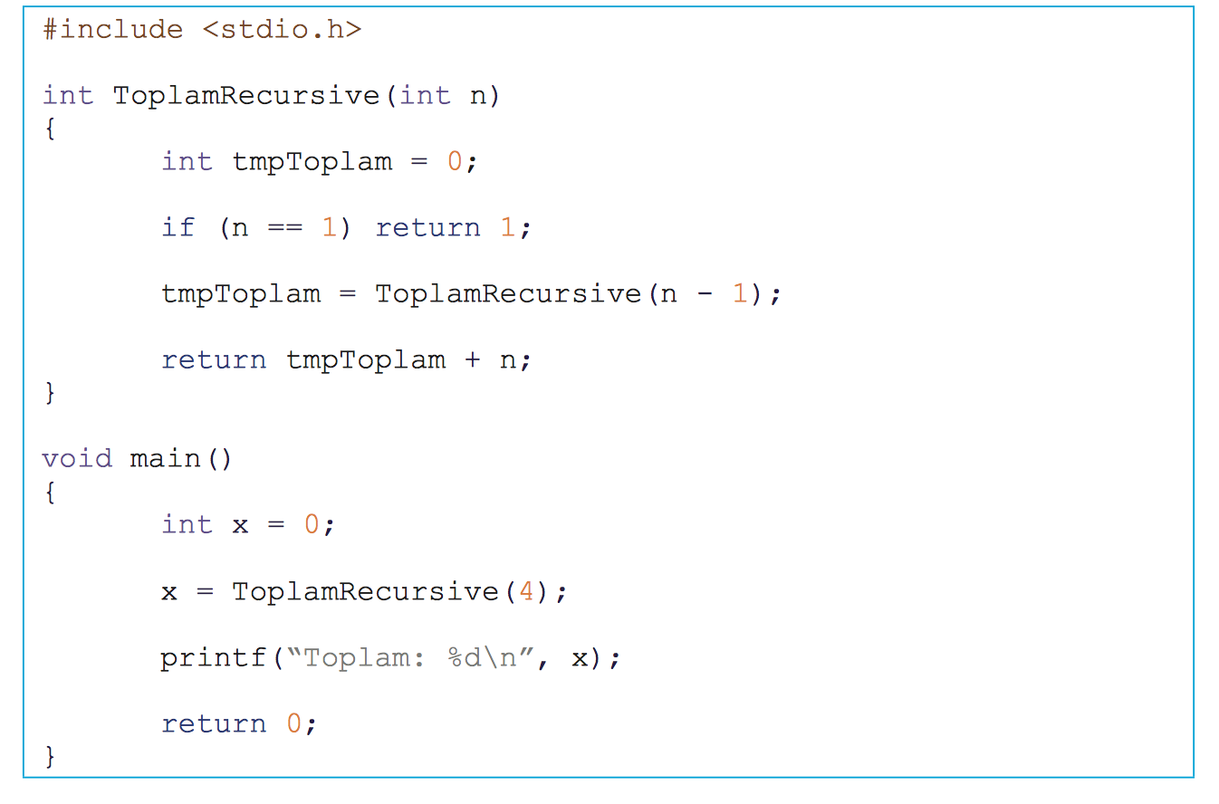 Bu problemi, 1’den 3’e kadar olan sayıların toplamına 4 sayısını ekleyerek bulabiliriz. Problemin en küçük parçasına geldiğimizde, yani 1’e kadar olan sayıların toplamını hesapladıktan sonra geriye doğru gelerek bulduğumuz sonuçları birleştirerek ana sonuca ulaşmaktayız.