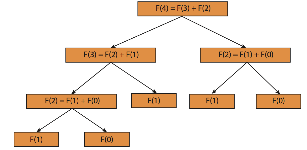 Dördüncü Fibonacci sayısının özyinelemeli fonksiyon ağacı aşağıdaki şekilde verilmiştir. Bu ağaçtan da görüldüğü üzere ağacımızı oluştururken taban duruma gelince ağacımızın yaprakları oluşmuş olur. Bu dizi için taban durumumuz, dizinin 0. ve 1. elemanlarıdır. Bundan sonra gelecek bütün elemanları, bu elemanlara bağlı olarak hesaplayabiliriz.