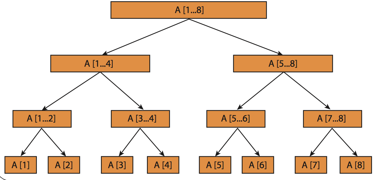 Aşağıdaki şekilde dizideki eleman sayısı 8 olduğundaki özyineleme ağacının yapısı görünmektedir. Problemin çözümüne, ağacın yapraklarındaki sonuçlar birleştirilerek başlanır ve birleştirme işlemi ağacın kökünde son bulur. Böylece genel çözüm hesaplanmış olur.