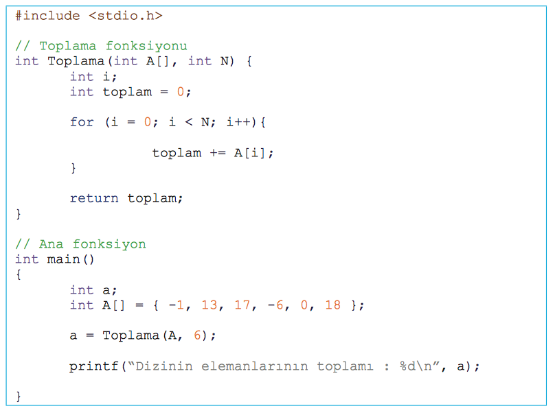 Söz konusu fonksiyon diziyi ve dizideki eleman sayısını giriş olarak almaktadır. Öncelik olarak toplam değerini tutacağımız değeri sıfır yapmaktayız. Daha sonra bir döngü içerisinde dizinin bütün elemanlarını sırasıyla bu toplam değerine ekliyoruz. Dizinin sonuna geldiğimizde elimizdeki toplam değeri, aradığımız sonucu oluşturmaktadır.