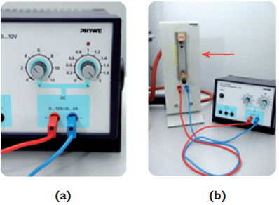 Elektrik bağlantı kablolarının su akış ölçerine (a) ve dc güç kaynağına takılması (b)