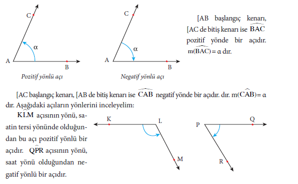 Bir açının kollarından biri başlangıç diğeri de bitiş kabul edilirse, saatin dönme yönü negatif, saatin ters yönü pozitif yön olarak kabul edilir. Böyle açılara yönlü açılar denir.