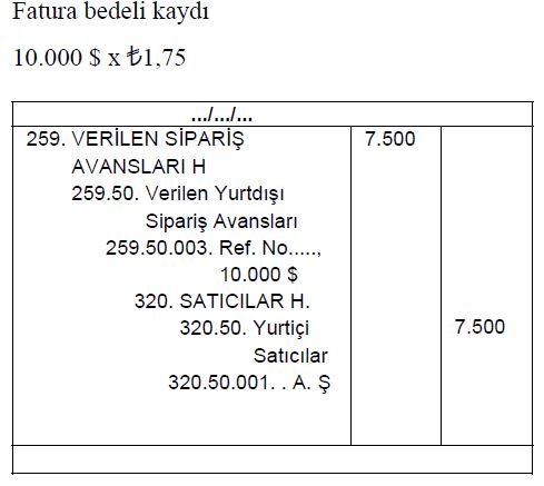 Hammadde, yardımcı malzeme, ticari mal ithalatı ile ilgili avanslar Verilen Sipariş Avansları ana hesabının yardımcı hesabı olan “159.50. Verilen Yurtdışı Sipariş Avansları” yardımcı hesabına kaydedilecektir.