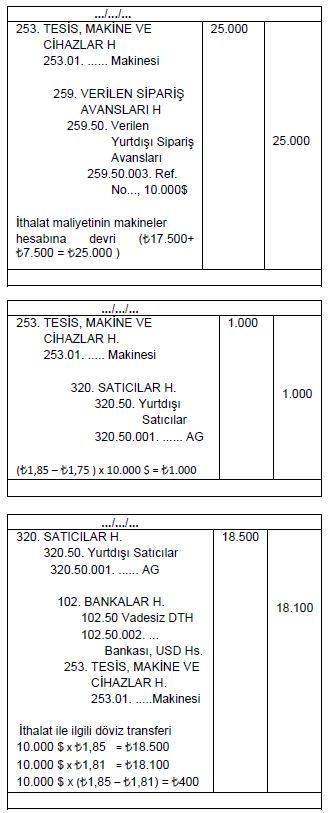 İthal edilen varlık (makine, araç - gereç gibi) duran varlık niteliğinde ise, duran varlıklar grubunda yer alan 259.50. Verilen Yurtdışı Sipariş Avansları yardımcı hesabı kullanılır. İthalat tamamlandıktan sonra hesap kalanı ilgili duran varlık hesabına devredilerek kapatılır.