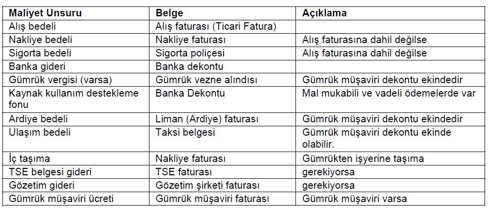 İthalat maliyet unsurları arasında alış faturası tutarı, faturaya dahil değilse navlun ve sigorta, banka giderleri, varsa gümrük vergisi, gümrükte ödenen ardiye-yükleme-boşaltma giderleri, varsa fonlar (Örnek. Kaynak Kullanım Destekleme Fonu), komisyonlar, gümrük müşaviri faturası tutarı yer alır. KDV ithalat maliyet unsuru değildir.