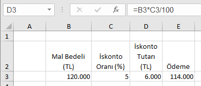 Örneğin bir işletme 120.000 TL tutarlı mal alımında erken ödeme nedeni ile % 5 iskontoya hak kazandığında, iskonto tutarı =B3*(C3/100) formülünden 6.000 TL, yapılacak ödeme ise =B3 – D3 formülünden 114.000 TL olarak hesaplanacaktır.