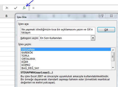 İşlem tablosu programlarında İşlev Ekle özelliği ile yerleşik işlevlere erişebilirsiniz. İşlev Ekle özelliğini Formül sekmesinden İşlev Ekle komutunu seçerek, ya da Formül Çubuğu'ndan İşlev Ekle düğmesine tıklayarak kullanabilirsiniz.