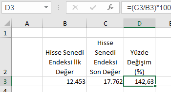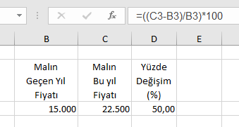 Hesaplamada öncelikle (C3 – B3) değeri ile malın fiyatındaki mutlak artış hesaplanmış, bulunan değer B3 hücresinde verilen geçen yıl değerine bölünmüş, çıkan sonuç ise 100 ile çarpılmıştır.