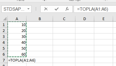 kullanarak yaptığınızda A8 hücresine =TOPLA(A1:A6) formülünü yazmanız yeterlidir. İlk yazdığınız formülle karşılaştırdığımızda işlev kullanarak formül oluşturmak daha kısa ve daha kolaydır. A1 ile A6 aralığına yazılan hücre değerleri topla işlevi kullanılarak A7 hücresinde görüntülenmiştir.