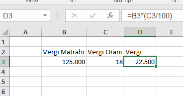 Örneğin; B3 hücresinde vergi matrahı olarak 125.000 TL, C3 hücresinde vergi oranı olarak 18 rakamı verilmiş ise,