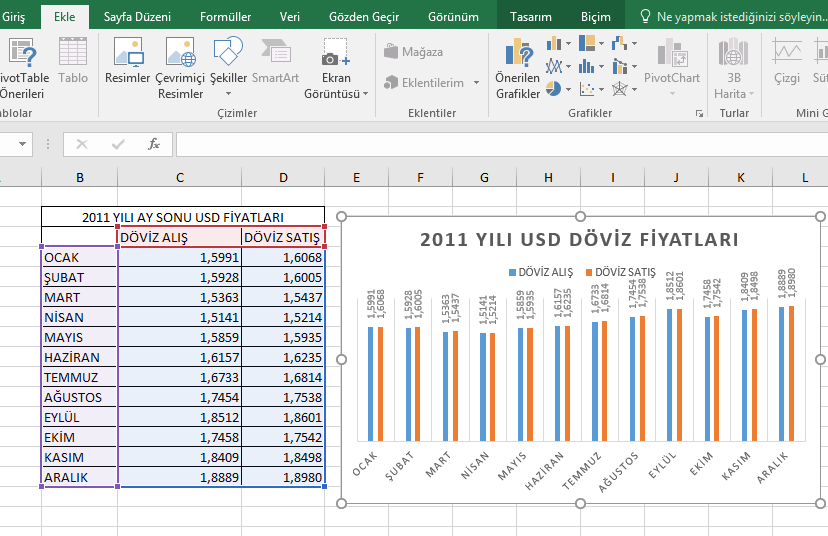 İşlem tablosu yazılımlarında grafik oluşturmak için öncelikle sayısal girdilerden oluşan bir veri aralığına sahip olmanız gerekir. Alan seçildikten sonra Ekle/Grafik /istenen grafik türü seçimi ile grafik çizilir. Verilen örnekte B3-D15 aralığı taranır. Ekle/Grafik/Kümelenmiş Sütun seçeneği ile grafik çizilmiştir.