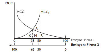 Yukarıda verilen grafiğe göre iki firma tarafından gerçekleştirilecek emisyon kontrolünün toplam maliyeti hangi alanların toplamına eşittir?