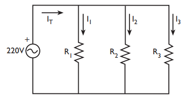 220 V’luk şebeke gerilimi şekildeki gibi üç yükü beslemektedir. I1= 2 A, I2=0.4 A, I3=5 A olduğuna göre şebekeden çekilen toplam akımı (IT) hesaplayınız.