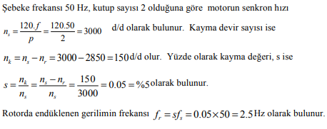 Üç fazlı iki kutuplu bir asenkron motor 50 Hz’lik frekansa sahip bir şebekede çalışmaktadır. Motorun tam yükteki hızı 2850 d/d dır. Bu motorun yüzde cinsinden kaymasını hesaplayınız. Rotorda endüklenen gerilimin frekansını hesaplayınız.