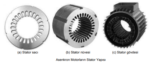 Stator asenkron motorun duran kısmıdır. Stator nüvesi birer yüzeyi yalıtılmış ince silisyumlu sacların preslenerek paketlenmesiyle meydana gelir. Stator nüvesi motor gövdesisin içine yerleştirilir. Statorun iç yüzeyine üç fazlı stator sargılarını yerleştirmek için oluklar açılmıştır.