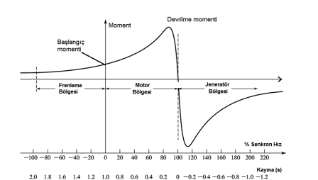 Şekilde bir asenkron motorun moment hız ilişkisi verilmektedir. Boş çalışma ile yüklü çalışma arasında moment yaklaşık doğru orantılı olarak değişir. Motorun ürettiği maksimum momente devrilme momenti denir. Bu moment motorun anma yük momentinin, yaklaşık olarak, 1.5 ila 2.5 katı kadardır. Devrilme momenti eşdeğer devre parametreleri kullanılarak yaklaşık olarak hesaplanabilir. Yol verme veya ilk kalkınma momenti anma momentinden biraz daha düşük olur. Asenkron motorlarda moment motora uygulanan gerilimin karesiyle değişir. Asenkron motorun rotoru senkron hızdan daha yüksek hızda döndürülürse motorda endüklenen momentin yönü değişir ve motor generatör olarak çalışır. Motor manyetik alan yönüne ters yönde dönüyorsa motor yavaşlayarak duracaktır (frenlenecektir).