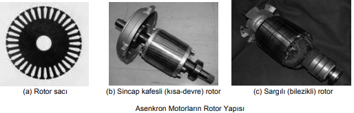 Asenkron motorlarda sincap kafesli ve sargılı olmak üzere iki farklı rotor çeşidi kullanılmaktadır. Sincap kafesli rotorların oluklarına genel olarak dökme alüminyum çubuklar yerleştirilmiştir. Alüminyum çubuklar rotorun her iki tarafından kısa devre halkaları yardımıyla birleştirilmiştir. Bazı motorların rotorlarında bakır çubuklar da kullanılmaktadır. Sargılı rotorlarda ise rotor oluklarına üç fazlı sargılar yerleştirilmiştir. Üç fazlı sargılar yıldız veya üçgen bağlanır. Sargı uçları mil üzerine yerleştirilen bileziklere bağlanır. Sargıların dış devre ile elektriksel bağlantısı fırça yardımıyla sağlanır. Fırçalar yardımıyla rotor sargılarına direnç bağlanabilir. Sargılı rotor bilezikli rotor olarak da adlandırılır.