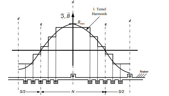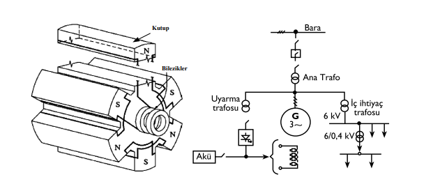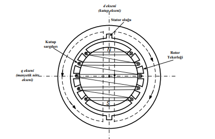 Senkron makinalar elektromekanik enerji dönüşümü yapan genelleştirilmiş alternatif akım makinalarıdır. Senkron generatörler mekanik enerji elektrik enerjisine, senkron motorlar ise elektrik enerjisini mekanik enerjiye dönüştürürler. Bütün döner elektrik makinalarında olduğu gibi senkron makinalarda da stator veya endüvi olarak adlandırılan bir durgun kısım ile rotor veya kutup tekerleği olarak adlandırılan bir dönen kısımı bulunur. Stator, asenkron makinalarda olduğu gibi, 3 fazlı makina için aralarında 120 elektriksel açı bulunan her faza ait dağıtılmış sargıları içerir. Rotor ise, doğru akım makinalarındaki kutup yapısının aynısına sahip kutup sargılarını taşır. O halde senkron makinalarda kutup sargıları bir doğru akım kaynağı ile beslenecektir. Bu besleme rotor mili üzerine yerleştirilen iki bilezik ve bu bileziklere basan firçalar yolu sağlanır. Uyarılmış kutup sargıları, rotor ile birlikte dönen bir manyetik alan oluşturur. Rotor üzerinde kutup sargıları ile oluşturacağımız alanı sabit mıknatıslar ile de oluşturabiliriz.