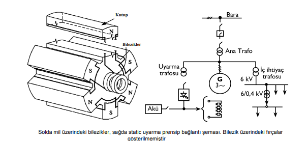 Uyarma için gerekli olan DA bu sistemlerde bir kontrollü güç elektroniği doğrultucusundan elde edilir. Elede edilen gerilim, mil üzerine yerleştirilmiş fırça-bilezik sistemi ile kutup sargılarına uygulanır. Uyarma gücünün düşük olması sebebi ile, senkron generatörden elde edilen gerilim, uyarma trafosu adı verilen bir trafo ile uygun gerilim değerine düşürüldükten sonra doğrultulup sargılara uygulanır. Kendinden uyarma sistemlerinde ilk yol verme anında uyarmayı sağlamak üzere bir akü gurubu bulunur.