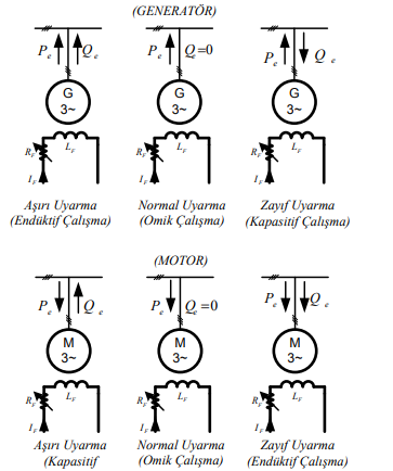Generatör ve motor çalışmalalarda, uyarmanın durumuna göre güç akışları nasıl olur?