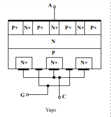Şekilde görüldüğü gibi GTO, klasik tristöre göre daha karmaşık bir yapıya sahiptir. Yüksek oranda katkı içeren “+” işaretli katmanlar vardır. Kapı ve katod birbirine yakın ve dar kanallardan oluşmaktadır. İleri kutuplamada merkezi N-P jonksiyonu gerilimi tutar ancak ters kutuplamada bloke yapılamaz. Ama ters bloke yapabilen GTO’lar da yapılmıştır. GTO’lar karmaşık yapıları sebebiyle daha yüksek kilitleme akımına sahiptir.