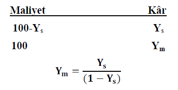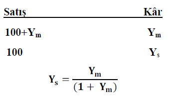 Maliyet üzerinden %Y kazanmak 100 TL’ye mal olan bir malı (100+Y) TL’ye satmak anlamına gelir. 100 TL’ye mal edilip, (100+Y) satılan bir malın satış fiyatı üzerinden kâr yüzdesini bulmak için aşağıdaki eşitlikten faydalanılır: