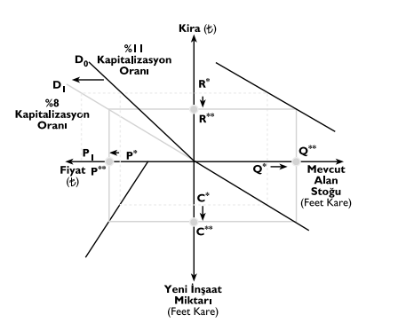 Mevcut kullanım alanı miktarı sabit iken ofis alanı talebinin artması ile, öncelikle yükselen kira değerleri söz konusu gayrimenkul fiyatlarını yani ofis alanı fiyatlarını arttıracaktır. Fiyatların artması inşaat sektörünü canlandıracak ve söz konusu dönem içindeki yeni inşaat miktarı artacaktır. Yeni üretilen kullanım alanı miktarının mevcut stoğa eklenmesi sonucunda, yeni stok miktarı da artacaktır. Sonuç olarak, yeni dengeyi tanımlayan dikdörtgen alanı, mevcut dengeyi gösteren dikdörtgen alanının tamamen dışında yer almaktadır.