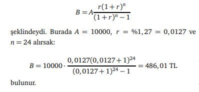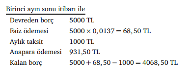 Borcu aldıktan bir ay sonra aldığımız borç için aylık bir faiz uygulanacak ve bu faiz de 5000×0, 0137 = 68, 50 TL olacaktır. Aylık taksit 1000 TL’yi ödedikten sonra kalan borç miktarı 5068, 50−1000 = 4068, 50 TL olacaktır. Bankaya birinci ay için ödenen 1000TL’nin 68, 50 TL’si faiz ödemesi ve geri kalan 1000 − 68, 50 = 931, 50 TL’si ise anapara ödemesidir.