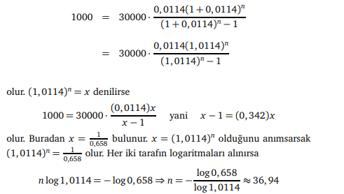 %1, 14 faiz oranıyla 30000 TL kredi çekelim. Eger ayda 1000 TL taksitle bu borcu geri ödersek r = 0, 0114, B = 1000 ve A=30000 değerleri formülde yerlerine yazılırsa kaç ayda borç biter?