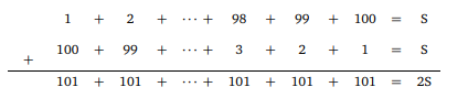 Görüldüğü gibi son satır 101’lerin toplamı oldu. Son satırda 100 tane 101 olduğundan 100 × 101 = 2S olur. Yani S = 100.101/2 = 5050 dir.