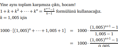 Bu yöntemle n ayda kaç lira biriktirebileceğimizi hesaplayalım. Başlangıçtaki 1000 liramız n ay sonra 1000·(1+0, 005)n olacak. 2’nci ay yatıracağımız 1000 lira ise n−1 ay bankada kalacagı için sonuçta 1000 ·(1+0, 005)n−1 liraya ulaşacak. 3’üncü ay yatıracağımız 1000 lira n−2 ay bankada kalacağı için sonuçta 1000 ·(1+0, 00)n−2 liraya ulaşacak. Bu şekilde devam edersek (n − 1)’inci ayda yatıracağımız para bir ay faizde kalacağı için 1000 ·(1+0, 005) lira olacak. Ve nihayet n’inci ayda da 1000 lira o ayın birikimi olarak elimizde olacak. Demek ki n ay sonra elimizde toplam,