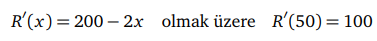 Çözümün diğer bir yolu için, Türevin anlık değişimi verdiğini biliyoruz. O halde gelir fonksiyonumuzun x = 50 için türevini hesaplarsak