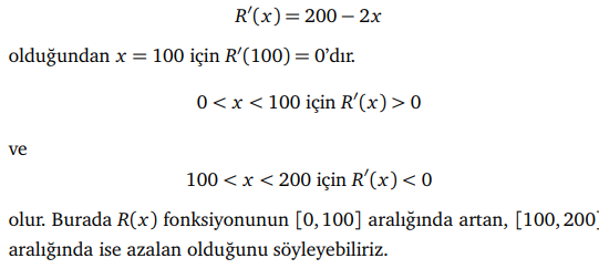 Bu bilgileri verilen tablo şeklinde de ifade edebiliriz. O halde gelirimiz satılan mal miktarı [0, 100] aralığında iken artmakta, [100, 200] aralığında iken azalmaktadır. Demek ki satış miktarı 100 birim olduğunda en çok gelir elde edilir