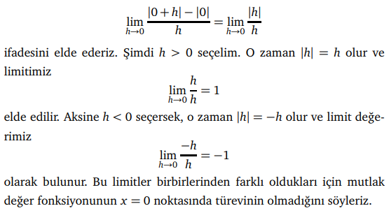 Fonksiyonun grafiğine dikkat ederseniz x = 0 noktasında bir köşe yaptığını görürsünüz. İşte genel olarak fonksiyonların bu tür köşe noktalarında türevleri olmayacaktır. O halde her sürekli fonksiyonun türevlenebildiği yanılgısına düşmeyin.