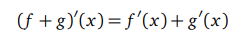 f ve g fonksiyonları bir x noktasında türevlenebilsinler. Bu durumda bu iki fonksiyonun toplamının x noktasındaki türevi, türevlerinin toplamına eşit olur