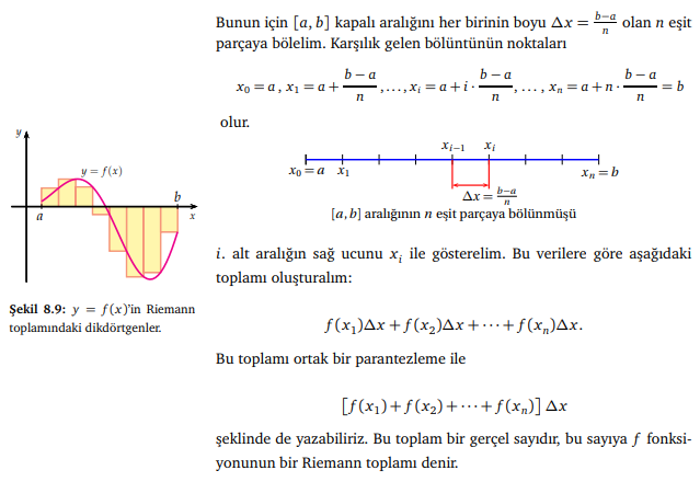 Riemann toplamı, bir eğrinin altındaki alanı çok sayıda basit şekle (dikdörtgenler veya yamuklar gibi) bölerek belirlenmiş olan, bu alanın yaklaşık değeridir.