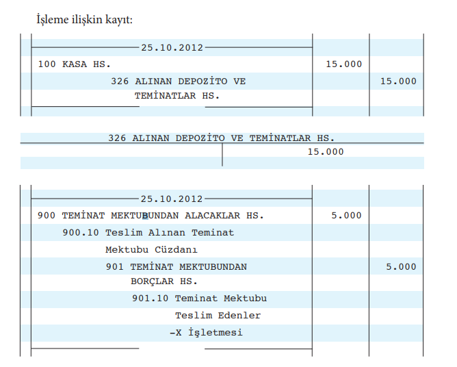 Üçüncü kişilerin belli bir işi yapmalarını, aldıkları bir değeri geri vermelerini sağlamak amacıyla ve belli sözleşmeler nedeniyle gerçekleşecek bir alacağın karşılığı olarak nakit şeklinde alınan depozito ve teminatlar kısa vadeli olarak alınmışsa “326.Alınan Depozito Ve Teminatlar” hesabının alacağında izlenir