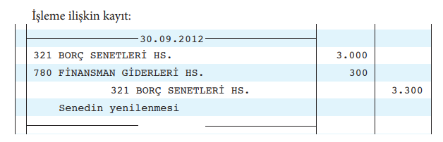 İşletme, 30 Eylül 2012 tarihinde, Satıcı E İşletmesine olan 3.000 lira nominal değerli bir senedini likidite sıkıntısı nedeniyle ödeyemeyeceği için senedin alacaklısı olan E işletmesiyle anlaşmış ve nominal değeri 3.300 lira olan 6 ay vadeli yeni bir senet düzenleyip vermiştir. Buna göre aşağıdaki işlemin kaydı nasıl olmalıdır?