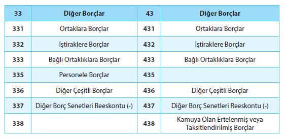 Tekdüzen Hesap Planı’nda kısa vadeli borçlar ‘33 DİĞER BORÇLAR’ grubunda ve uzun vadeli borçlar ise ‘43 DİĞER BORÇLAR’ grubunda izlenmektedir. Bu gruplara ilişkin hesaplar şöyledir: