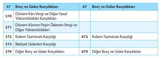 Bilanço tarihinde belirgin olarak ortaya çıkan ancak tutarının ne olacağı henüz kesin olarak bilinemeyen veya tutarı bilinmekle birlikte ne zaman tahakkuk edeceği tahmin edilemeyen kısa vadeli borçlar ve giderler için ayrılan karşılıkların izlendiği hesap grubudur. Bu karşılıklar aktifte belirli bir hesapla doğrudan ilişkilendirilemediği için aktifte ilgisiz karşılıklar olarak da bilinir. Şu hesaplardan oluşur: