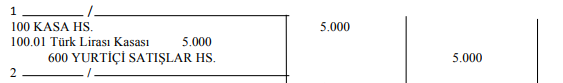 100 KASA hesabına 5.000 TL giriş olmuştur. Mal satıldığı için 600 YURTİÇİ SATIŞLAR hesabı alacaklandırılır.