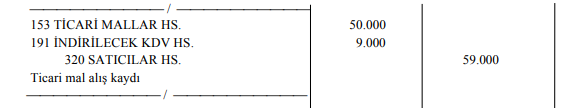 Cari dönem boyunca 50.000 TL değerinde ticari mal satın alınmıştır. Bu işlemin KDV dönemi yevmiye kaydını yapınız.