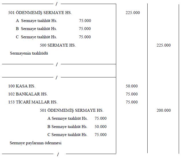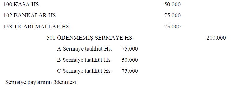 X Limited Şirketinin 225.000 TL tutarındaki sermayesi, üç ortak tarafından eşit paylarla taahhüt edilmiştir. Ortaklardan A, taahhüdü olan 75.000’ TL yi şirket adına bankaya yatırmış, ortaklardan B taahhüdünün 50.000 TL’sini işletmeye nakden ödemiş, C ise 75.000 TL tutarındaki ticari malı sermaye karşılığı olarak vermiştir. Bu bilgilere göre ortakların taahhüt ettikleri