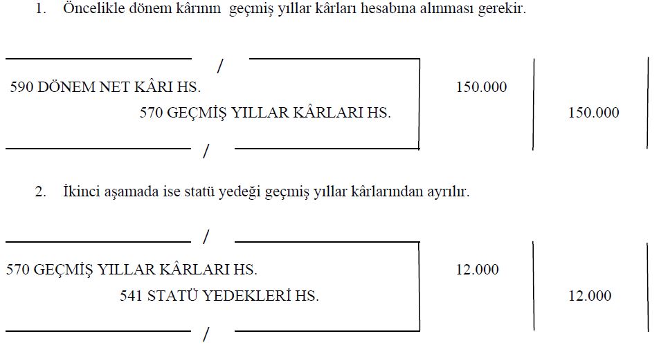Z A.Ş.’nin Genel Kurulu’nda, şirket ana sözleşmesinde yer alan hüküm gereğince, 150.000 TL tutarındaki dönem kârından 12.000 TL ’nın statü yedeği olarak ayrılmasına karar verilmiştir. Bu durumun muhasebe kaydı nasıl olmalıdır?