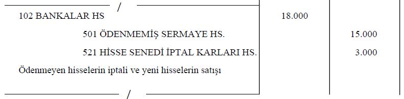 Anonim şirketlerde ortaklar, sermaye karşılığı taahhüt ettikleri borçlarını yasal süre içinde ödemek zorundadırlar. Kendine tanınan bu yasal sürede borcunu ödemezse ortaklıktan çıkarılır, yaptığı ödemeler geri verilmez ve diğer borçlarına da sayılmaz. Parası ödenmeyen hisseler iptal edilerek yenisi çıkarılır ve satılır. Yeni ortaklardan tahsil edilen tutar ile hisselerin nominal değeri arasındaki fark, eski ortağın ödediği tutardan fazla ise bu tutar, 521 Hisse Senedi İptal Kârları hesabına alacak kaydedilir. Söz konusu olumlu farkın sermayeye eklenmesi ya da başka amaçlarla kullanılması durumunda hesap borçlandırılır.