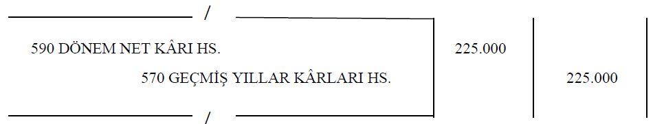C A.Ş.’nin dönem sonunda gerçekleşen 225.000 TL tutarındaki bilanço net kârı, izleyen dönemin başında kâr dağıtımı ve yedek ayrılması gerçekleştirilmek üzere ilgili hesabına alınmıştır. Bu işlemin kaydı nasıl yapılır?