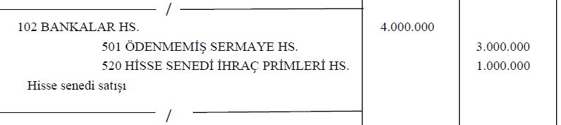 (Y) A.Ş. 12.000.000 TL olan sermayesini 1/4 oranında artırmaya karar vermiş ve çıkardığı hisse senetlerini borsada oluşan fiyat üzerinden banka aracılığıyla satmıştır. Banka bu satış işlemiyle ilgili olarak 60.000 TL komisyon vb. gider kestiğini ve satış bedeli olarak hesabımıza 4.000.000 TL’ nin işlendiğini bildirmiştir. Bu bilgilere göre hisse senedi satışı nasıl muhasebeleştirilir?