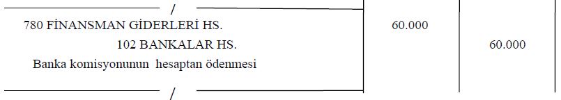 (Y) A.Ş. 12.000.000 TL olan sermayesini 1/4 oranında artırmaya karar vermiş ve çıkardığı hisse senetlerini borsada oluşan fiyat üzerinden banka aracılığıyla satmıştır. Banka bu satış işlemiyle ilgili olarak 60.000 TL komisyon vb. gider kestiğini ve satış bedeli olarak hesabımıza 4.000.000 TL’ nin işlendiğini bildirmiştir. Bu bilgilere göre banka komisyonunun hesaptan ödenmesi nasıl muhasebeleştirilir?